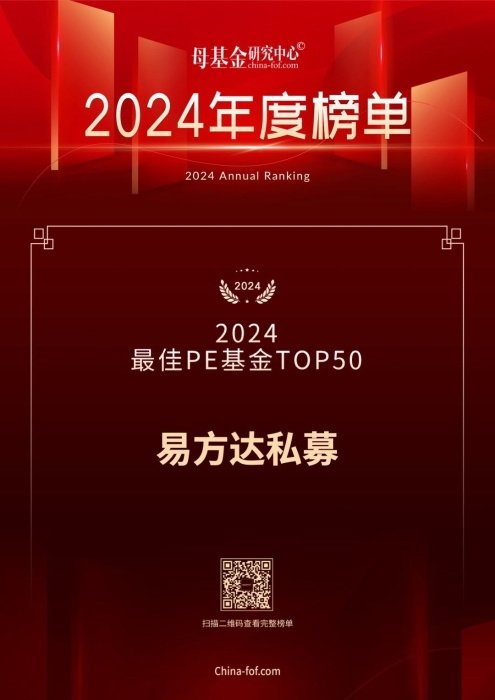 易方达私募获评母基金研究中心2024年度榜单“最佳PE基金TOP50”